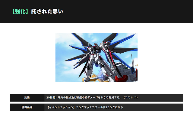 通称中立。SEAZON1から存在し、とても汎用的な1枚です。発動とともにコストゲージを+5してくれるのでどんな状況にも対応できます。出撃コストにするもよし、MSアビリティ発動用とするもよし、様々です。アーセナルベースプレイヤーはまず指揮官レベル20を目指せと言われる所以です。